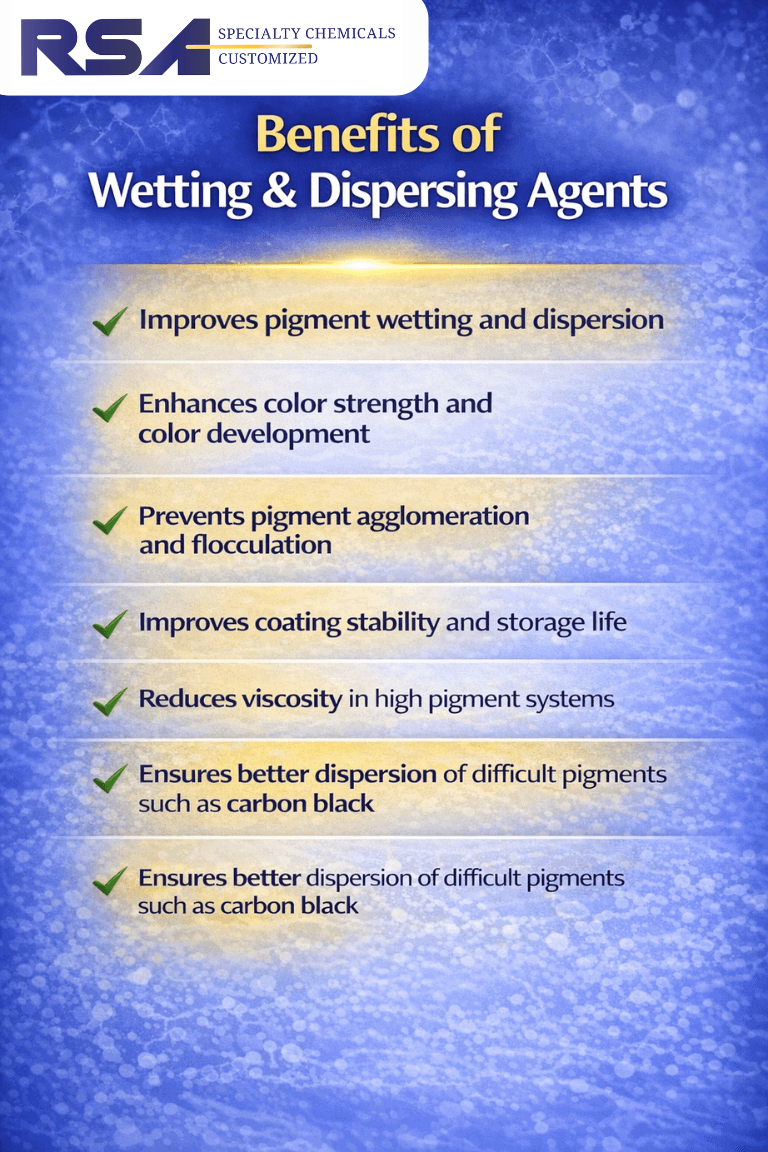 Wetting and dispersing agents play a critical role in paint and coating formulations by ensuring that pigments and fillers are properly wetted, uniformly distributed, and stabilized within the liquid medium. Poor wetting or dispersion can lead to defects such as flocculation, flooding and floating, color inconsistency, viscosity drift, and reduced coating performance.